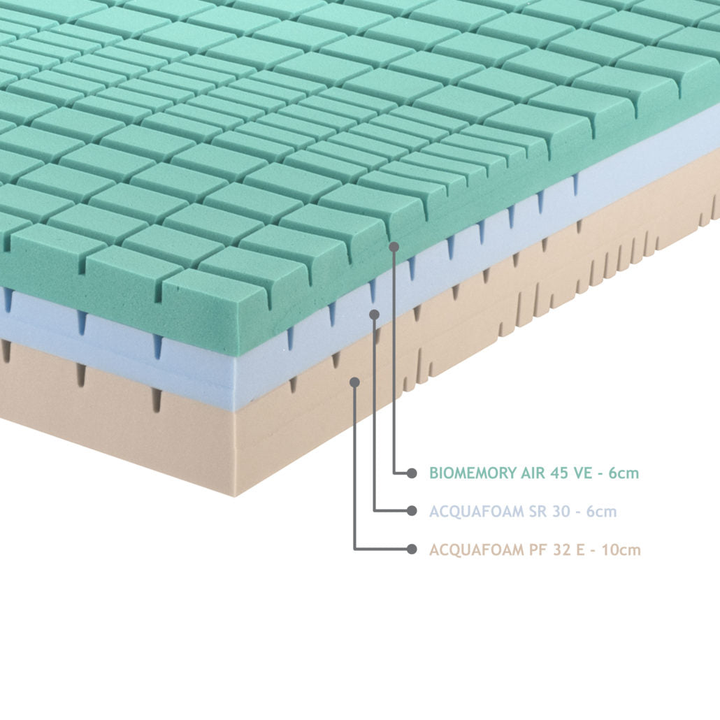 Il Nucleo è composto è realizzato con prodotti vegetali e materie prime innovative (Biomemory e Acquafoam) schiumato ad acqua a cellula aperta che assicurano il sostegno del corpo nella posizione più confortevole.